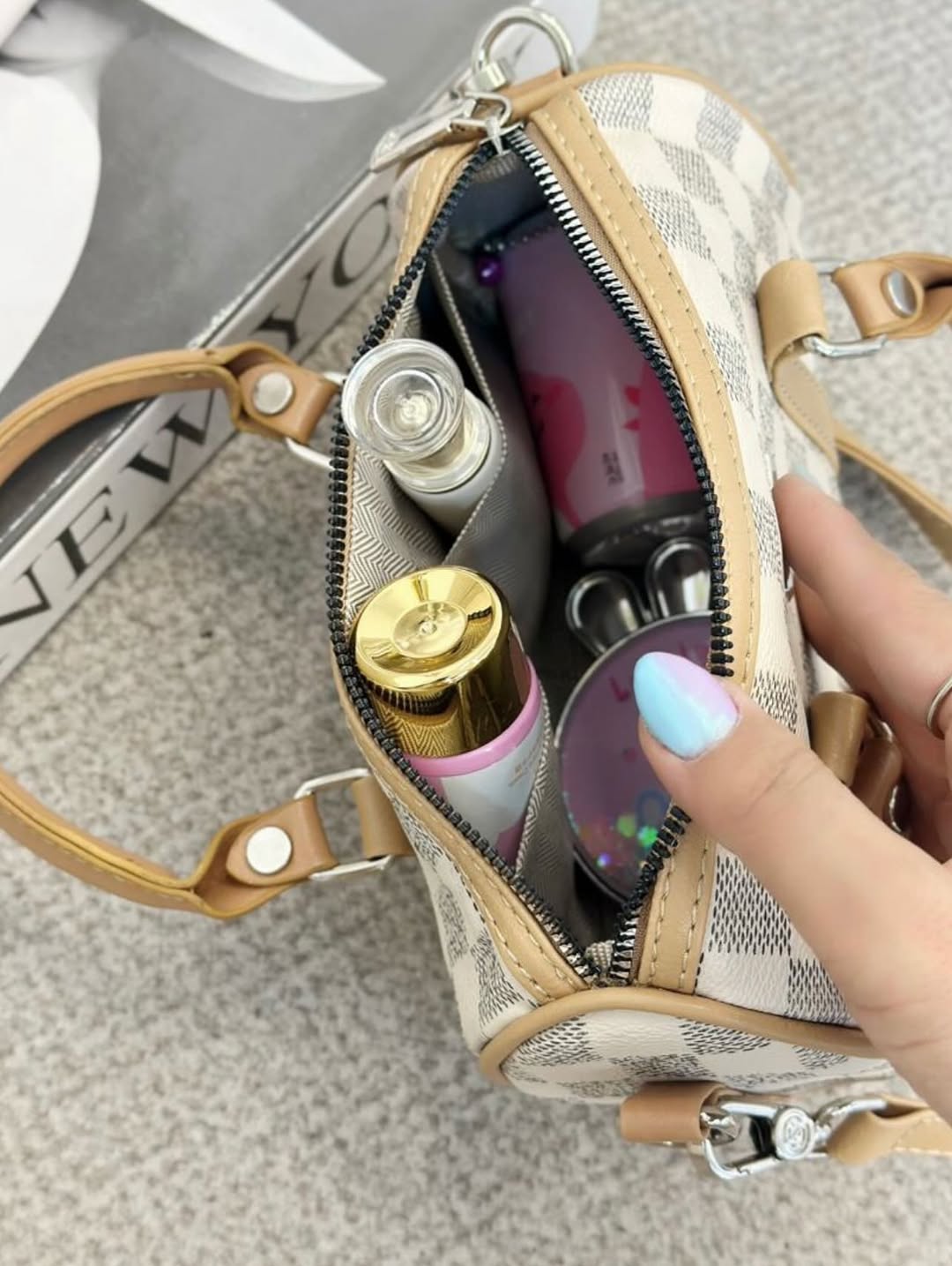 + موارد بیشترکیف دوشی صندوقی طرح مارک با دسته دار و بند بلند و زیپ داخل کار، ابعاد: ۲۲.۱۲.